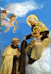 Op 16 juli 1251 verscheen de H.Maagd hem en overhandigde hem het scapulier als 't teken van haar bijzondere bescherming, met de belofte, dat, wie in dit kleed zou sterven, van de pijnen der hel zal worden gevrijwaard.