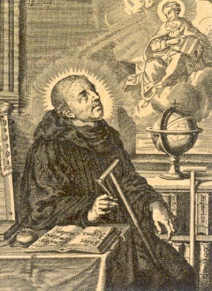 Hij wordt afgebeeld als benedictijner monnik met een kruk.